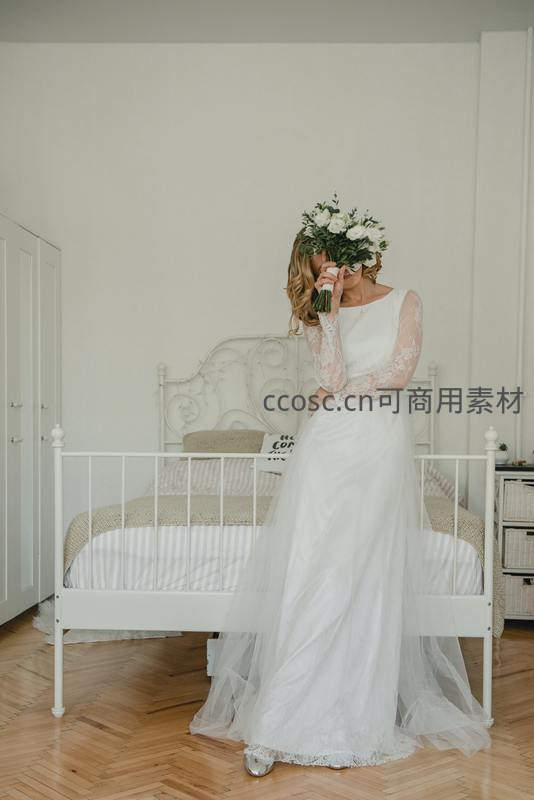 新娘身穿蕾丝长袖婚纱,用花束半遮面容,站在白色铁艺床前,姿态羞涩而优雅,房间明亮简洁,流露温柔待嫁之情。