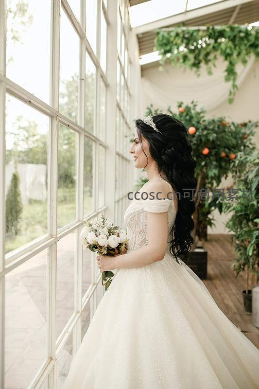 新娘身着华丽露肩婚纱,佩戴精致发冠,手捧白玫瑰花束,站在明亮玻璃窗前,侧脸微笑凝望窗外,背景绿植环绕,氛围梦幻唯美。