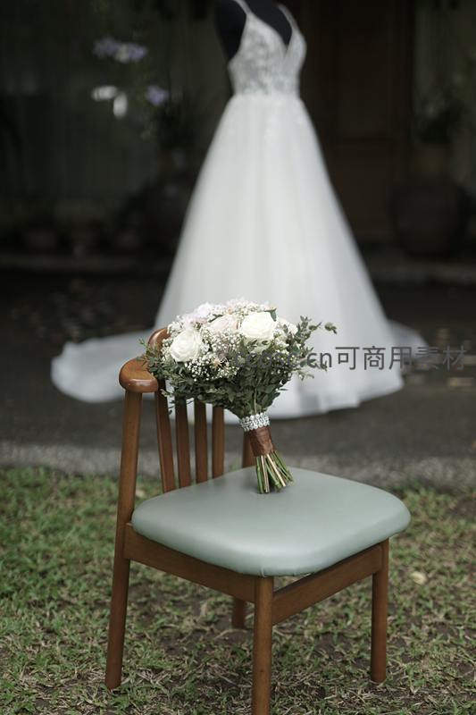 椅上花束与背景婚纱静物