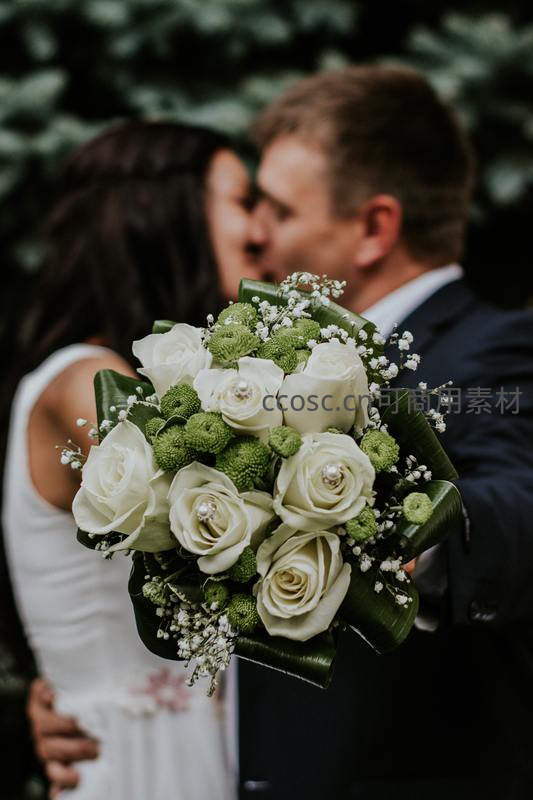 镜头聚焦于一束以白玫瑰和绿色球状花材为主的精致捧花,背景中新人正在亲吻,营造出朦胧而温馨的婚礼氛围,情感饱满动人。