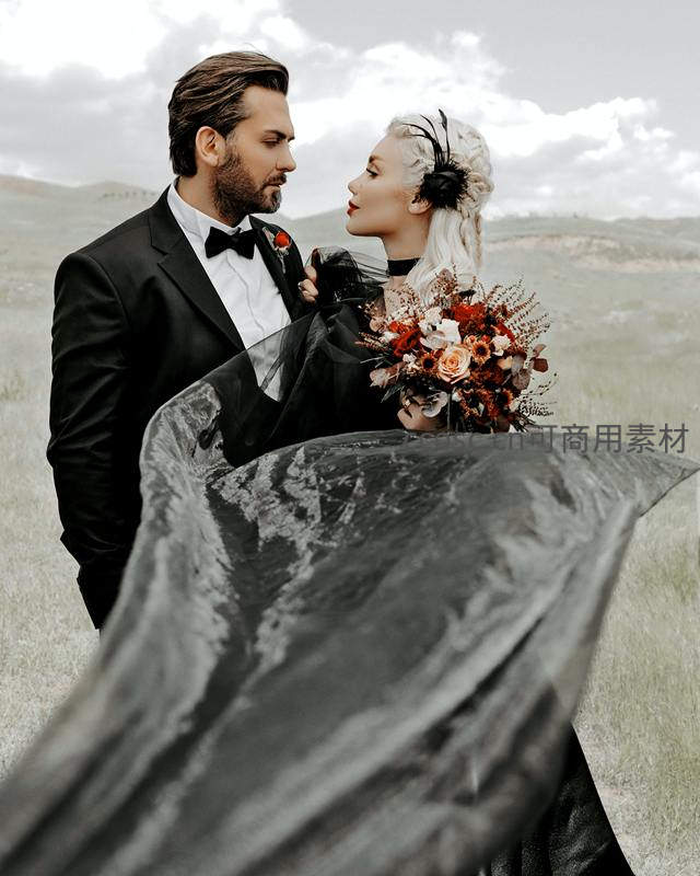 一对新人身着黑白色调礼服,在辽阔草原上深情对视,新娘手持秋日花束,长裙随风飘扬,远处山丘云层衬托出电影感画面。