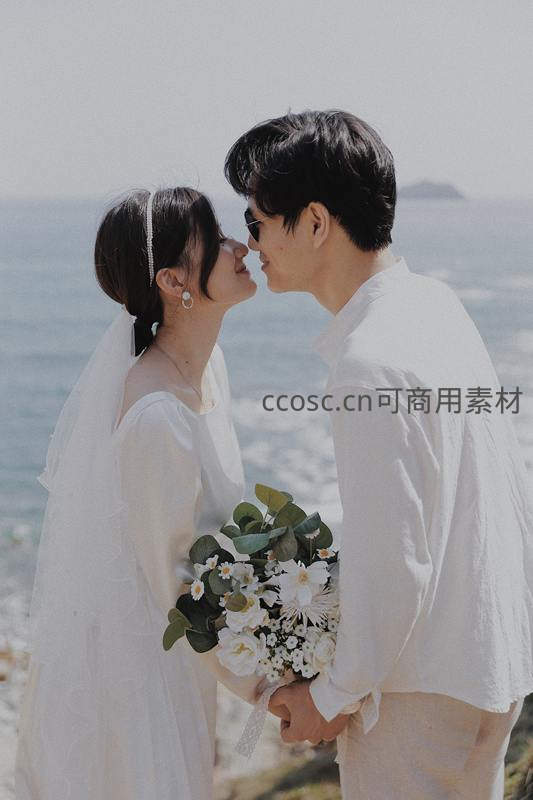 新婚夫妇在蔚蓝海岸边深情亲吻,新娘头戴简约发饰,手捧清新花束,阳光洒落,海浪轻拍,营造出纯净而唯美的爱情场景。