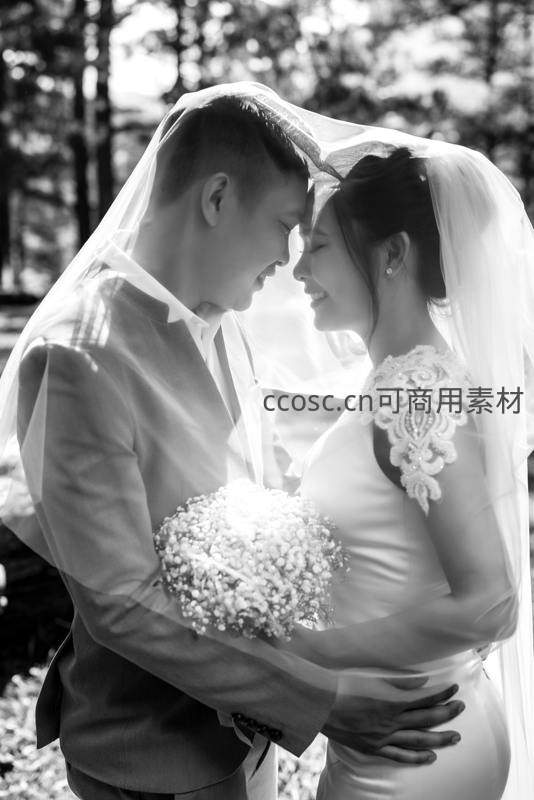 森林中黑白情侣,面纱轻掩甜蜜对视