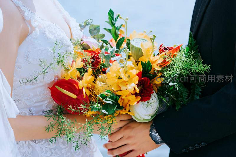 一对新人在户外紧紧相拥,新娘身穿白色婚纱,新郎着黑色西装,手中捧着色彩鲜艳的花束,充满爱意与温馨。