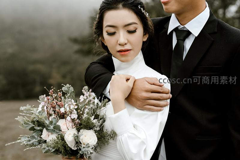在薄雾笼罩的山间,新郎从背后环抱新娘,她手持花束闭目微笑,黑白灰的色调更显情感深沉,营造出静谧唯美的氛围。
