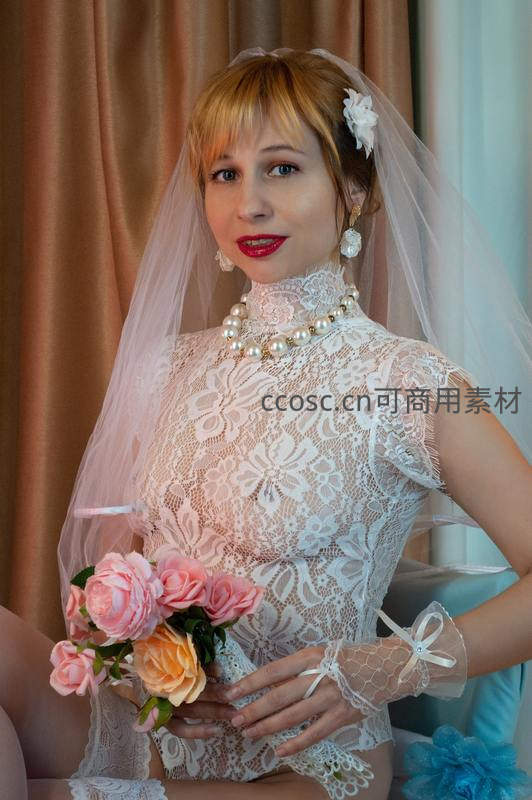 复古新娘佩戴珍珠项链,手持玫瑰花束