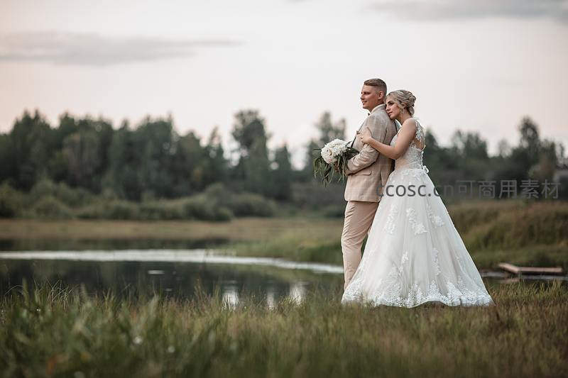 新婚夫妇背对镜头相拥站立于湖畔草地上,夕阳将天空染成暖色,水面倒影与绿树环绕,定格甜蜜永恒时刻。