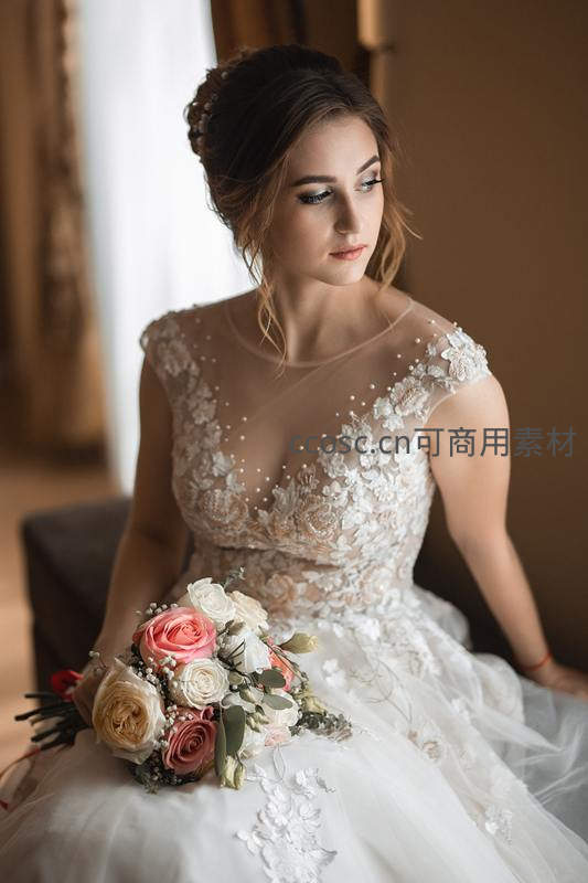 一位身着精致蕾丝婚纱的新娘,手捧粉色与白色相间的花束,眼神温柔地望向窗外,氛围静谧而充满期待。