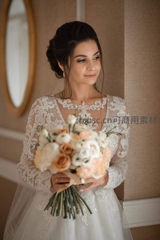 新娘面带浅笑,目光温柔落在手中花束上,蕾丝长袖婚纱细节精致,背景简约温馨,定格幸福时刻。
