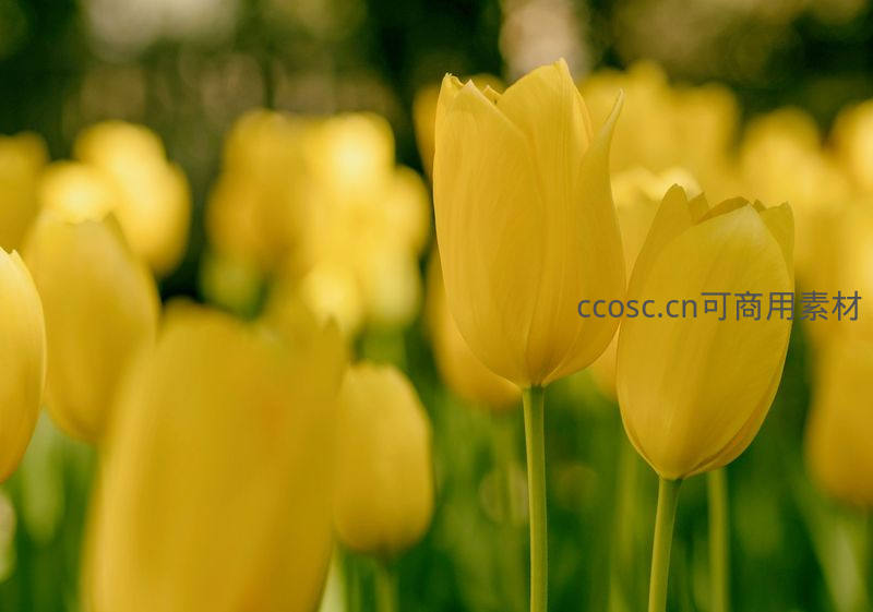 在温暖的春日阳光下,一片金黄色的郁金香竞相绽放,花瓣柔美细腻,背景虚化营造出梦幻般的田园氛围。