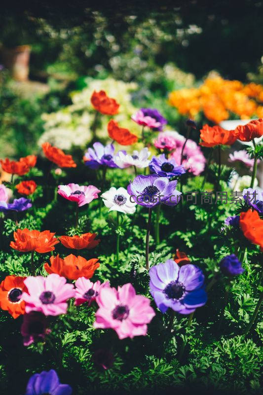 阳光洒落,各色银莲花在翠绿叶片间争奇斗艳,橙红、粉紫、纯白交相辉映,营造出梦幻而温暖的春日花园景象。