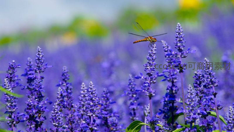 一只橙色蜻蜓轻盈地停留在一片紫色薰衣草花穗顶端,背景虚化朦胧,凸显了生物与自然和谐共生的宁静瞬间。