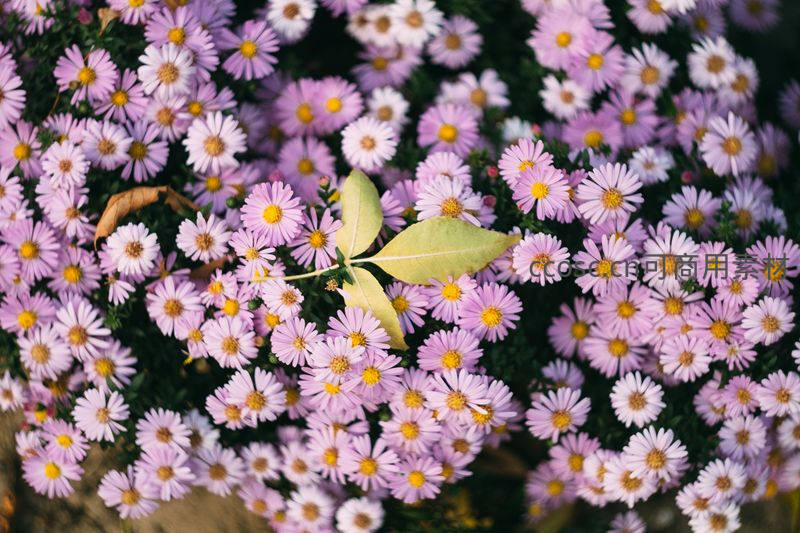 淡紫雏菊丛中一片绿叶点缀其间