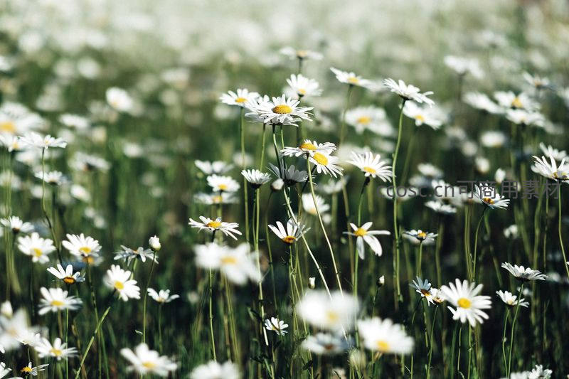 广阔田野上无数雏菊迎风摇曳,洁白的花瓣与嫩黄的花蕊在绿草间若隐若现,阳光洒落,营造出宁静纯真的田园诗意。