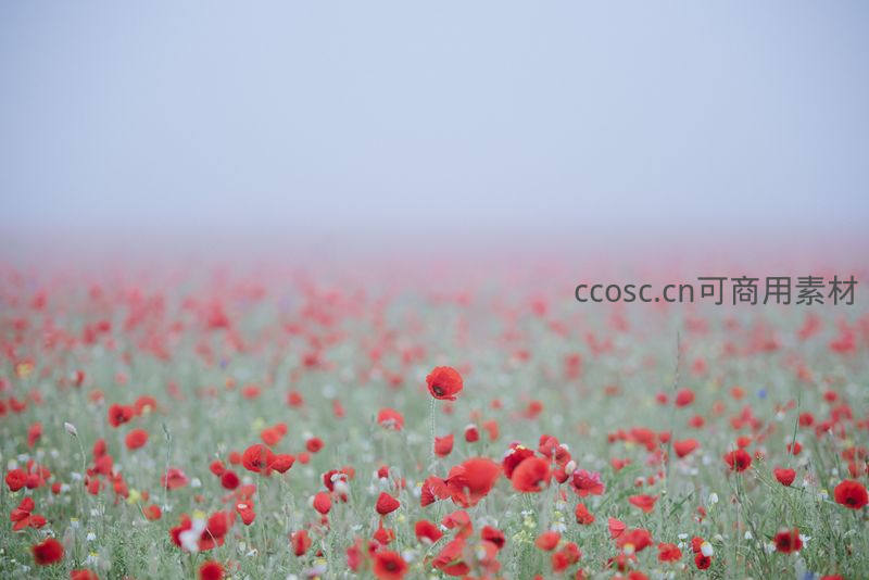 薄雾笼罩罂粟田,红花点点如梦似幻
