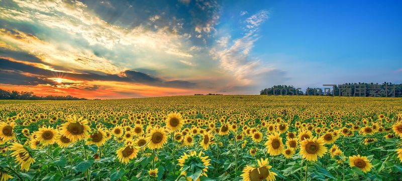 向日葵海迎朝霞,金色花盘耀蓝天