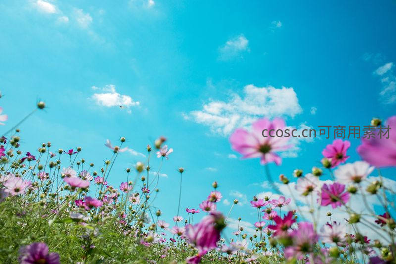 在清澈的蓝天白云下,大片粉紫色波斯菊迎风摇曳,绿叶衬托,充满生机与浪漫气息,是春日郊游的理想背景。