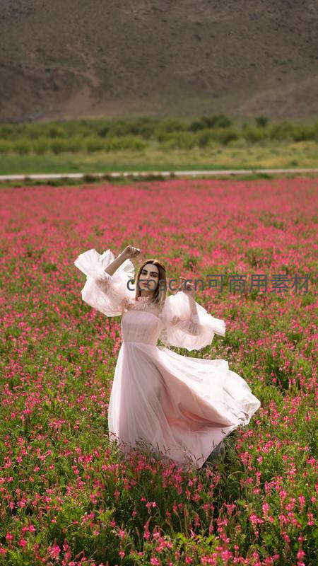粉裙少女舞动于花海,山野间绽放的浪漫诗篇