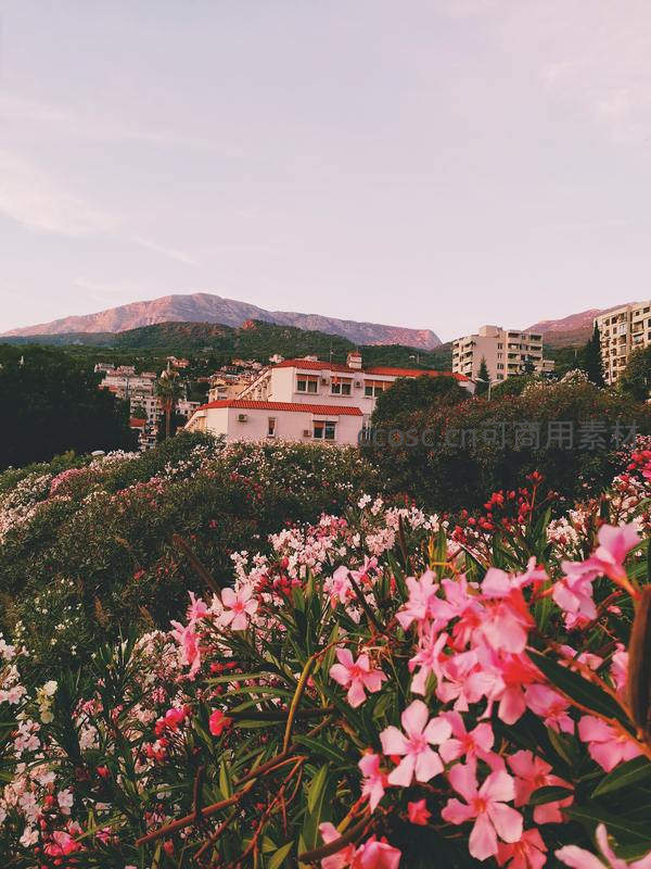 前景是盛开的粉红色夹竹桃,中景是错落有致的白色房屋,远景则是笼罩在暮色中的连绵山脉。一幅融合了城市、自然与人文的静谧画卷徐徐展开。