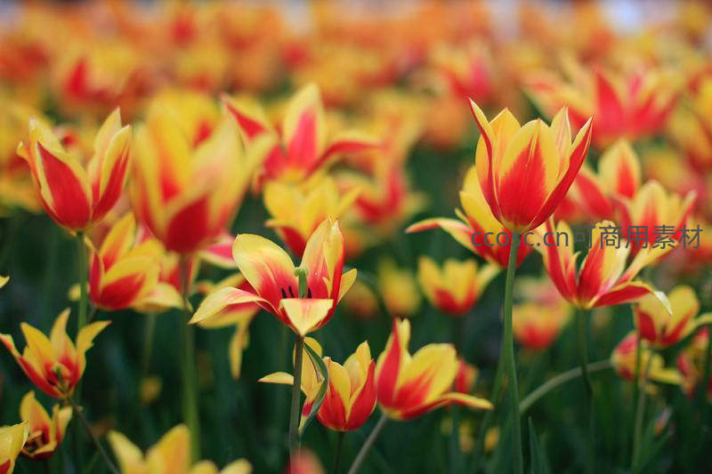 鲜艳的红黄双色郁金香在阳光下竞相开放,花瓣层次分明,色彩饱和度高,微距镜头捕捉到花朵的细腻纹理与蓬勃生命力。