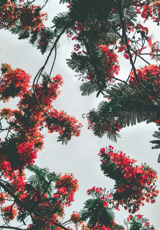 从低角度仰望,火红的凤凰花簇拥在深绿色羽状复叶间,与灰白色天空形成鲜明对比,充满热带风情与视觉冲击力。
