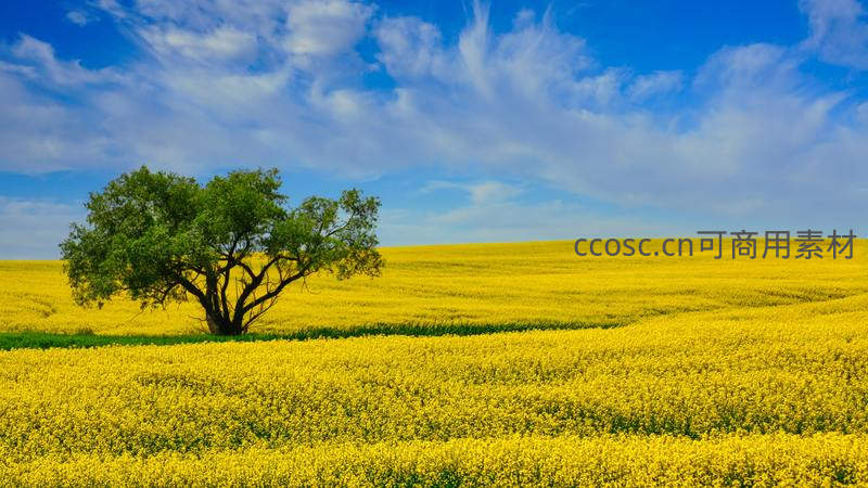 一棵苍劲的绿树独立于无垠的金色油菜花海中,头顶是湛蓝天空与朵朵白云,构成一幅壮阔而宁静的田园画卷。