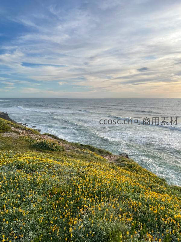 悬崖边盛开着大片黄色野花,下方是波涛翻滚的蔚蓝大海,远处天际线交融,展现壮丽的滨海自然景观。