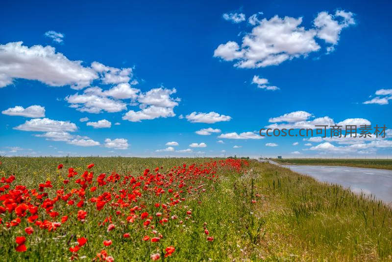 公路旁罂粟花海,蓝天白云映衬自由旷野