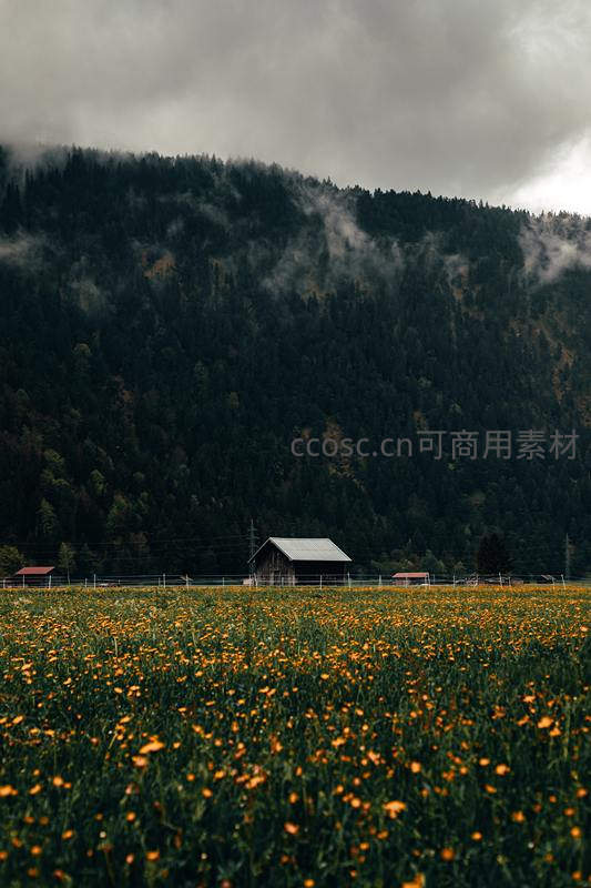 远山被薄雾笼罩,葱郁森林下是金黄花海与孤寂木屋,构成一幅远离尘嚣的诗意田园画卷。