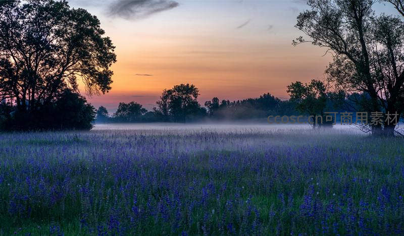 晨雾弥漫的蓝紫色花田与剪影树林的静谧黎明