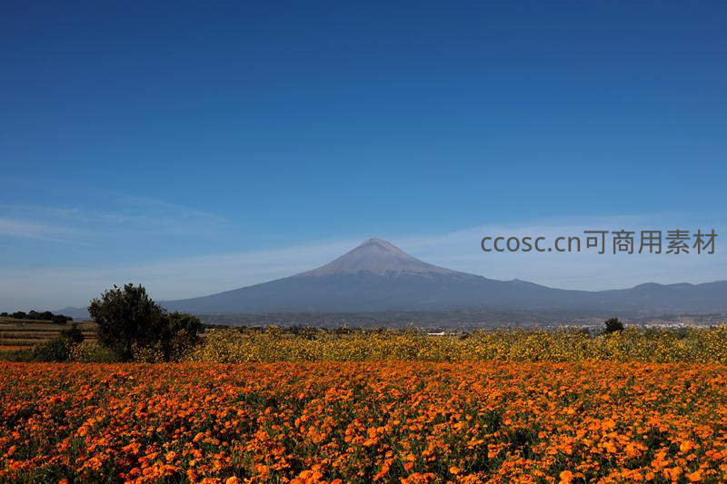 橙色花海映衬雄伟火山,蓝天之下壮丽无边