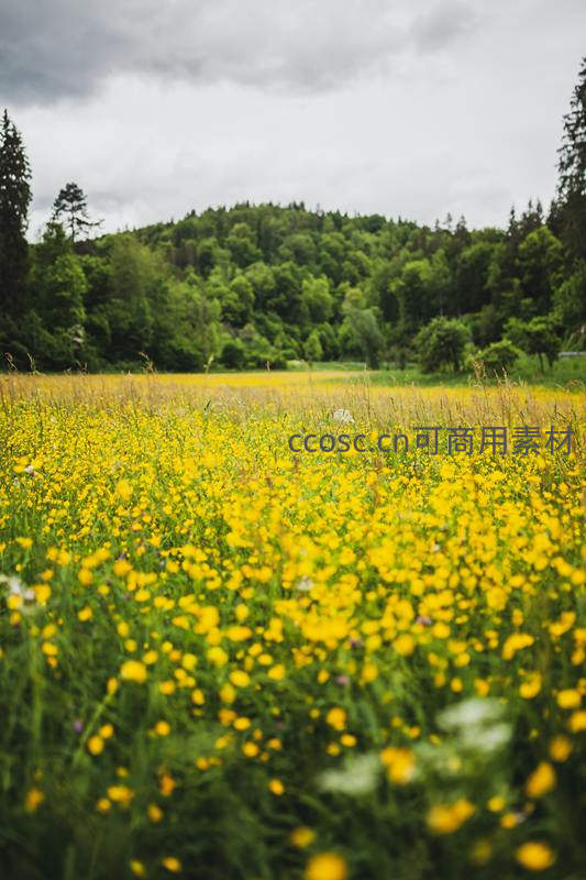 大片金黄色野花在微风中摇曳,前景虚化营造梦幻感,远处青山郁郁葱葱,天空云层厚重,整体氛围清新自然,充满乡野气息。