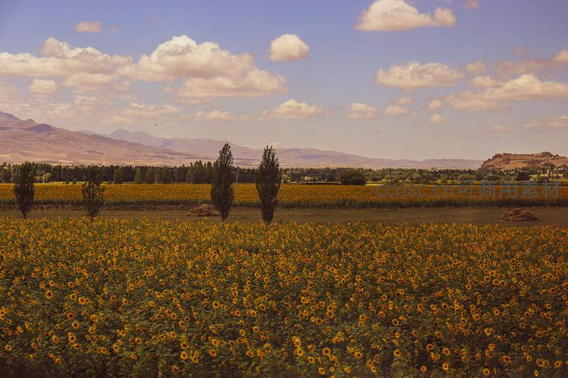 金黄的向日葵铺满大地,远处连绵山脉与朵朵白云构成壮丽背景,几棵孤树点缀其间,展现夏日田园的辽阔与生机。