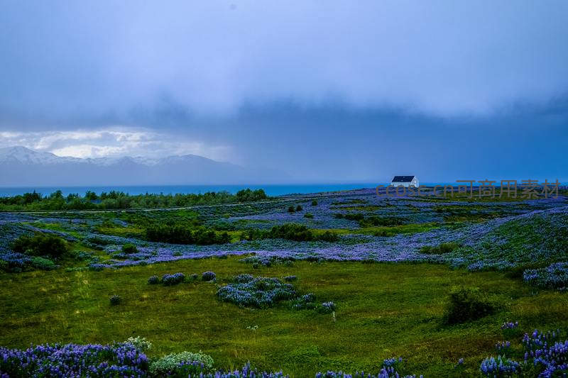 在阴沉的天空和远处海景的映衬下,一片紫色花田与绿色草地交织,一座白色小屋孤独地伫立其中,充满诗意与静谧感。