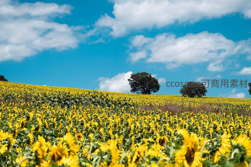 无垠的向日葵花海在蔚蓝天空下铺展,朵朵金黄朝向阳光,远处几棵孤树静立坡顶,构成一幅充满生命力的田园诗画。