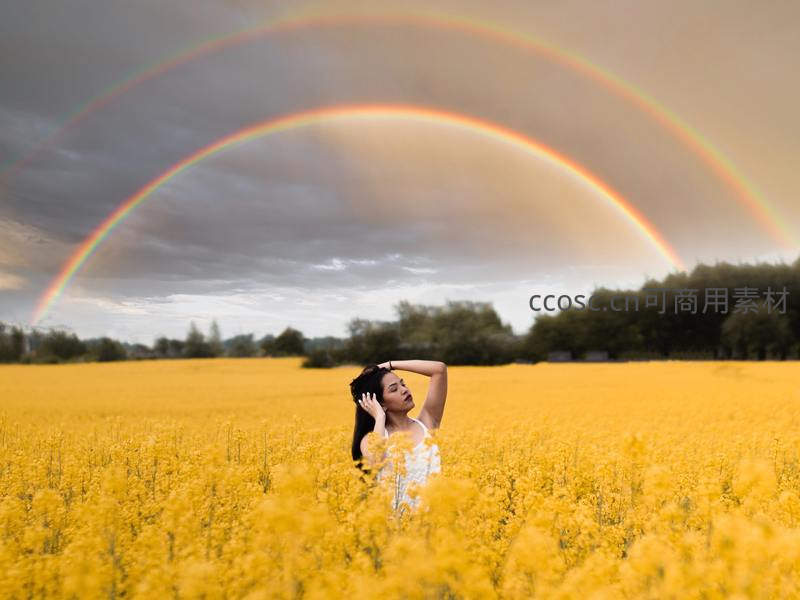 双彩虹横跨天际,一位女子置身于金黄油菜花海中仰望天空,画面充满童话般的浪漫与宁静,展现人与自然和谐之美。