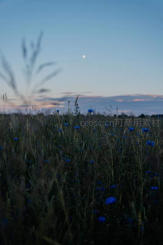 黄昏时分,蓝色野花散落在广袤草地上,远方天空悬挂一轮明月,云霞渐染,整个画面充满诗意与宁静的田园气息。