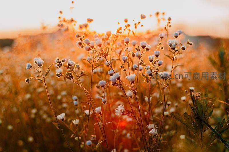 夕阳西下,金色光芒穿透细长的野花茎秆,白色小花在逆光中透出柔和轮廓,整片花田笼罩在温暖梦幻的光影之中。