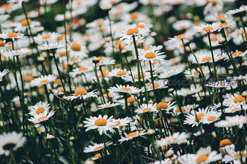 成片的白色雏菊在微风中轻轻摇曳,黄色花心点缀其间,绿茎挺拔,构成一幅清新自然、充满生命力的田园画卷。
