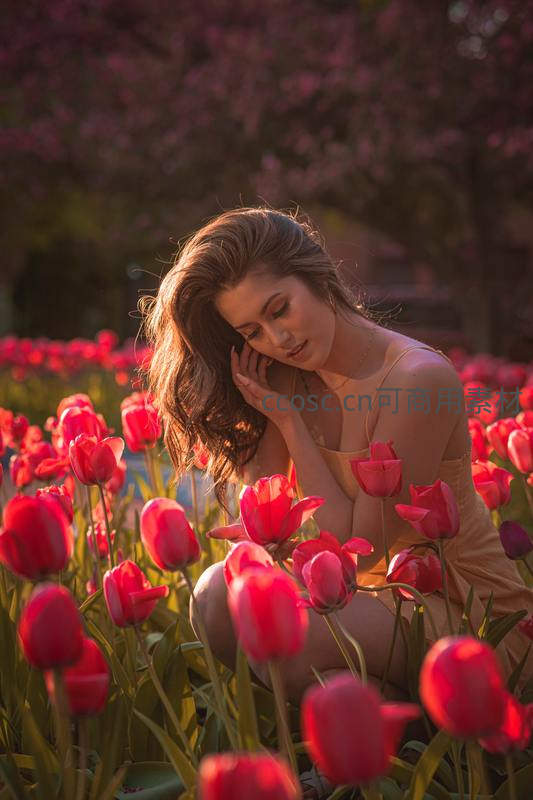 在夕阳余晖中,一位少女蹲在火红郁金香花丛间,轻抚面颊,神情温柔恬静,营造出浪漫唯美的春日氛围。