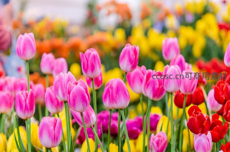 粉红色郁金香在阳光下盛放,背景是缤纷的各色花朵,构成一幅充满活力与希望的春日画卷,洋溢着温暖与喜悦。