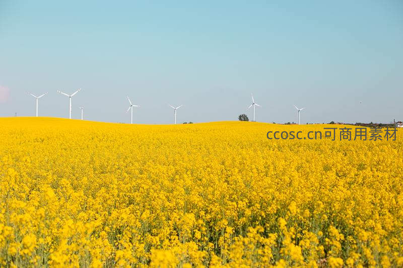 洁白的风力发电机静静伫立于浩瀚的油菜花田之上,象征着清洁能源与自然美景的完美融合,描绘未来田园新图景。