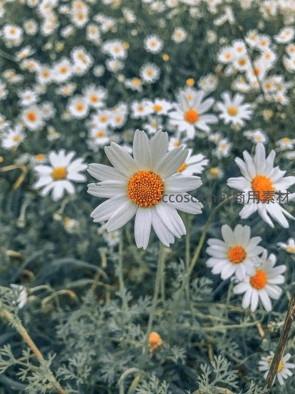 一片繁茂的雏菊花田,洁白的花瓣与橙黄色花蕊相映成趣,绿叶衬托下更显生机勃勃,微风轻拂带来宁静与治愈感。