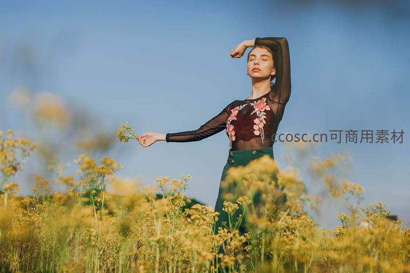 一位身着精致刺绣上衣的女子伫立在金色花海中,闭目舒展肢体,与自然融为一体,展现出宁静、自由与艺术美感。