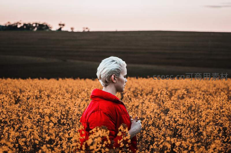 银发少女身着鲜红外套,伫立在无垠的金色花海中,背景是柔和的暮色天空,构成一幅充满艺术感的视觉画卷。