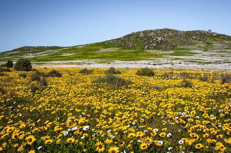 广袤的黄色野花铺展至远方山脚下,与青翠山峦和湛蓝天空相映成趣,呈现壮丽开阔的自然景观与季节魅力。