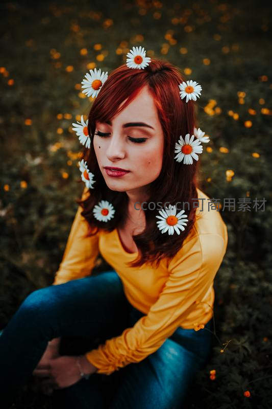 一位红发少女身着黄色上衣,在花丛中安静地闭目冥想,几朵洁白的雏菊点缀在她的发丝间,营造出一种温柔、梦幻且充满自然气息的氛围。