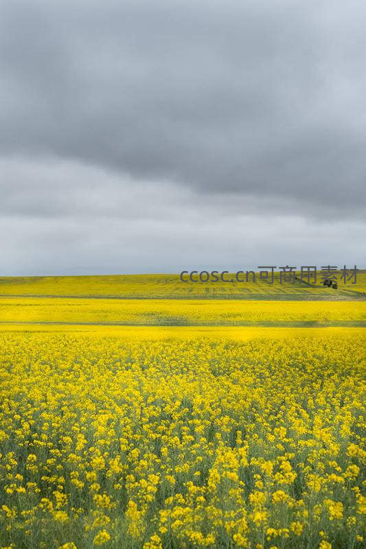 大片金黄色的油菜花田在厚重灰云的笼罩下铺展至远方,形成强烈的色彩对比,展现了大自然在阴郁天气中依然蓬勃的生命力与壮阔景象。