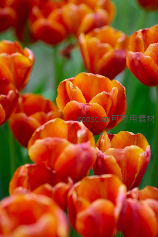 鲜艳的橙红色郁金香在绿叶衬托下盛开,花瓣层层叠叠,充满生机与活力,展现春日花海的绚烂之美。