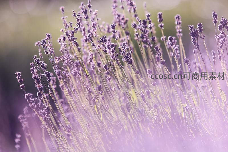 淡紫色薰衣草花穗在柔光中轻轻摇曳,背景虚化营造朦胧氛围,细腻呈现其优雅形态与宁静诗意。